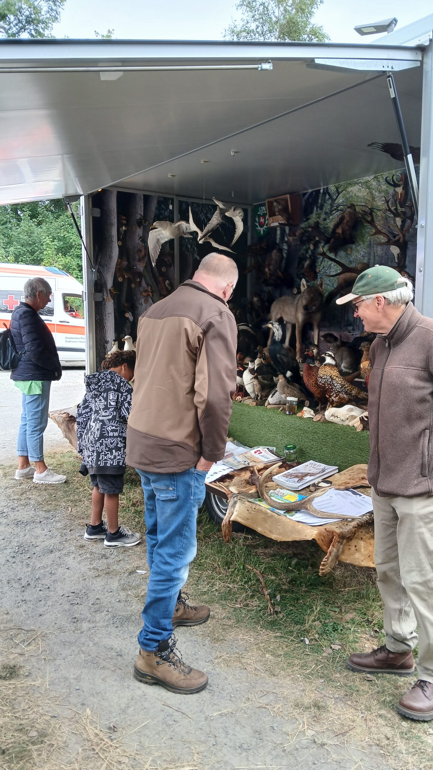 Am darauffolgenden Tag (23.08.2025) kam der Info-Wagen auf dem Kinderfest des Oxstedter Schützenvereins zum Einsatz. Die Begeisterung bei Kindern und Erwachsenen war auch hier wieder groß. Den Jägern wurden viele Fragen gestellt, wie: „Sind das alles echte Tiere?“, „Sind die Augen echt?“ oder „Wie alt sind die Präparate?“. Das älteste Präparat der Sammlung, ein Kampfläufer, ist 85 Jahre alt.