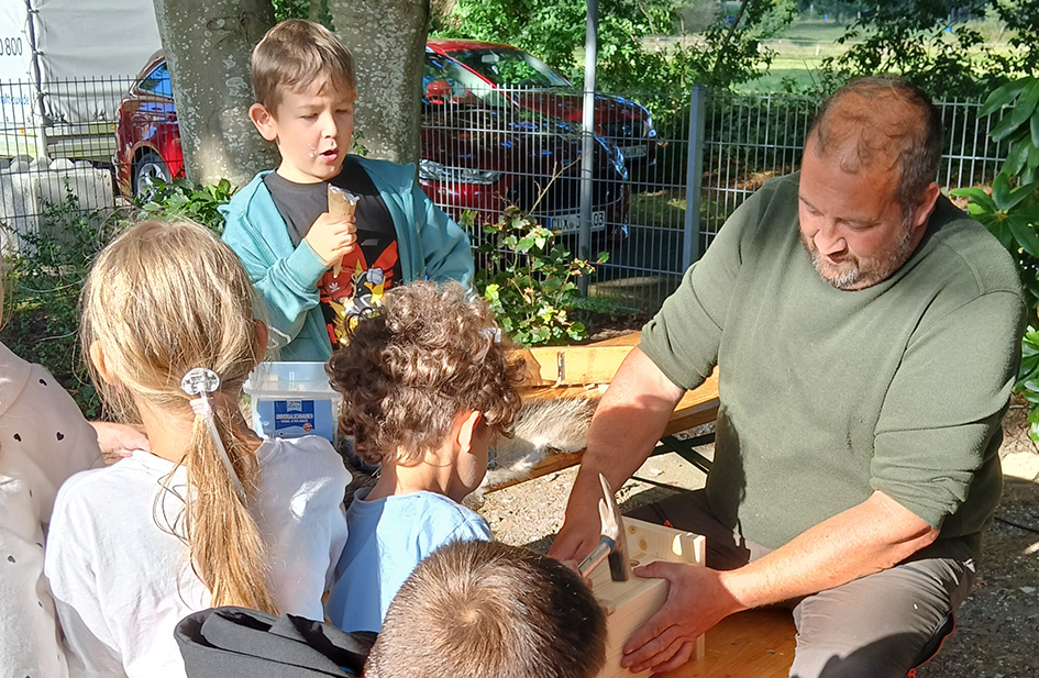 Auch die neuen Präparate Uhu und Wolf fanden großes Interesse. Beide haben vor 6 Monaten ihren Platz im Wagen gefunden. Die teilnehmenden Kinder hatten wieder die Möglichkeit Nisthilfen für Gartenvögel zu bauen. Insgesamt haben die Kinder an beiden Veranstaltungstagen über 50 Nistkästen mit Akkuschrauber und Hammer gebaut.