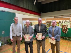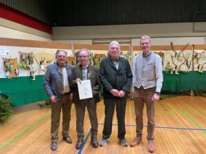 - Ehrung Rehkitzretter von links: Vorsitzender Andreas Schwanke, Berthold Hudaf, Klaus-Dieter Hoops (Hegeringleiter Hegering 2) und Klaus Dock als besonderer Vertreter des Kreisjägermeisters.