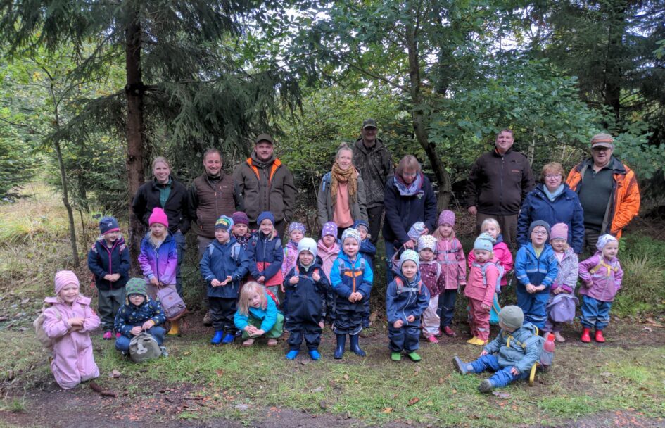 Die Kinder und Erzieher der DRK-Kindertagesstätte Armstorf erlebten einen ganz besonderen Vormittag im Wald. Gemeinsam mit sieben Armstorfer Jägern ging es mit Trecker und Anhänger auf Entdeckungstour. Die Mädchen und Jungen der pädagogischen Einrichtung wurden mit einem Planwagen abgeholt, der sie in den nahegelegenen Wald brachten. In einer Waldhütte startete der Tag gemütlich mit einem gemeinsamen Frühstück. Unter dem Motto „Wer isst was“ bekamen die Kinder Basiswissen über die Fressgewohnheiten der Waldtiere vermittelt. Anschließend wurden verschiedene Tierpräparate gezeigt und erklärt – Reh, Dachs, Wiesel & Co. konnten aus nächster Nähe bestaunt werden. Ein Highlight waren auch die zwei Jagdhunde, die sich geduldig streicheln und beobachten ließen. Bei einem kleinen Waldspaziergang entdeckten die Kinder zahlreiche Dachsbauten mit bewohnten Röhren und lernten, wie der Dachs lebt und wo er schläft.